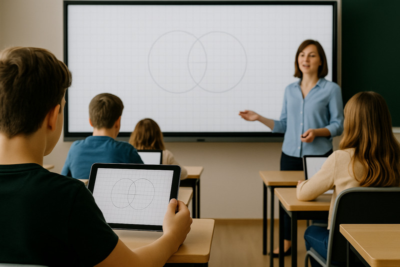 Wer bei uns einen Kasten zeichnen will, nimmt das Geodreieck – wie im echten Heft. Wer eine saubere Zeichnung braucht, muss den Zirkel einstellen und am Geodreieck einen Winkel ablesen können. Und wer einen Pfeil zeichnen möchte, greift einfach zum Stift, statt sich durch unzählige Pfeilarten zu klicken.